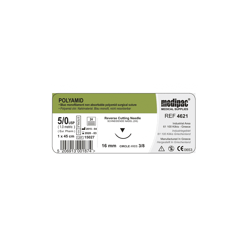 Περιγραφή: Μη απορροφήσιμα, μονόκλωνα, γαλάζια χειρουργικά ράμματα από πολυαμίδιο (νάιλον) 5.0. (16mm-3/8-45cm)