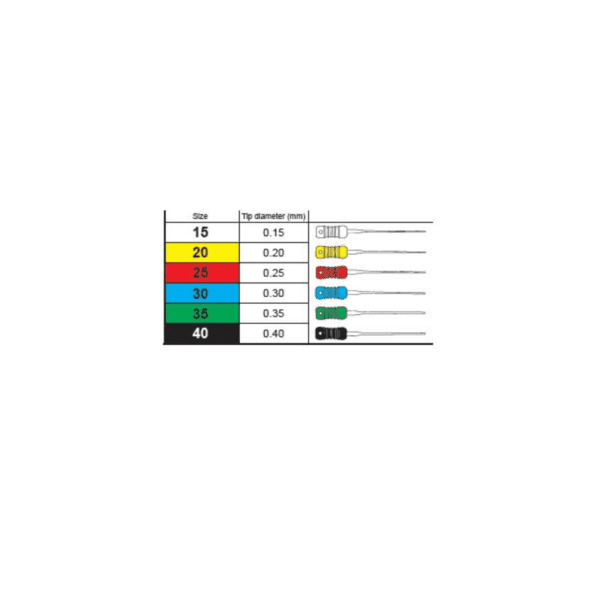 Περιγραφή: Μικροεργαλεία δακτύλων υψηλής αντοχής, για αρχική διάνοιξη δυσπρόσιτων ενασβεστιωμένων ριζικών σωλήνων. Αποστρογγυλεμένο άκρο για αποφυγή διατρήσεων, κατάλληλα για χρήση πριν τη μηχανική διεύρυνση. Μήκος: 25mm