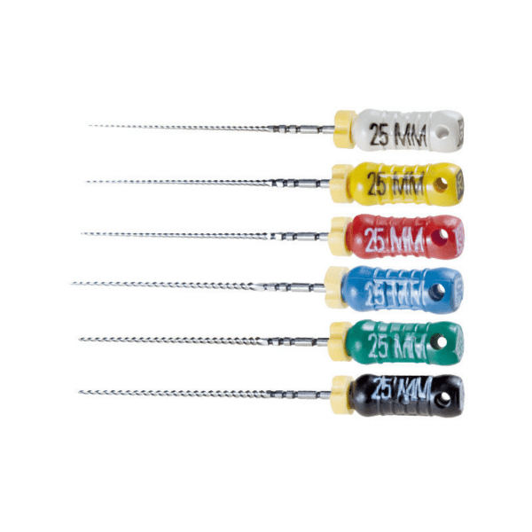 Περιγραφή: Διευρυντήρες εξαιρετικά ανθεκτικοί, κατασκευάζονται από ειδικό κράμα ανοξείδωτου χάλυβα με ομοιόμορφη δομή, για μέγιστη αντοχή στη θραύση και μέγιστη ευκαμπτότητα. Ασφαλής είσοδος του μικροεργαλείου κατά μήκος του ριζικού σωλήνα χάρη στο ανενεργό άκρο του. Μήκος: 25mm